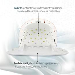 Lampa poate fi comutată, prin simpla apăsare a unui buton, de la 48W la 24W, dacă clientul usucă gelul, și înapoi la 48W, dacă începe să lucreze cu un sistem de gel. Lampa nu este dăunătoare pentru piele sau ochi și nu conține ingrediente nocive. Nu înțeapă în timpul polimerizării. Lampa de unghii are, de asemenea, un design interesant, sub forma unei emisfere, ceea ce face ca aceasta să se potrivească ușor pe întreaga mână. Potrivit pentru uz casnic și salon.