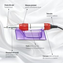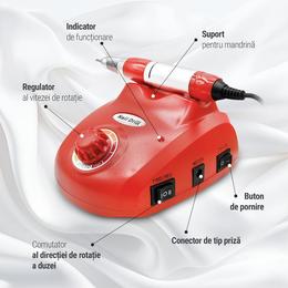 Pila electrica manichiura are un design compact si practic, astfel nu va ocupa mult loc pe masa de manichiura. Are un aspect original, in culoarea sa rosie, acesta se va incorpora ideal pe masa de manichiura.