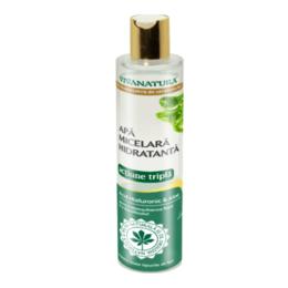 Apa Micelara Hidratanta cu Acid Hialuronic & Aloe Viva Natura, 250 ml: apa micelara hidratanta cu acid hialuronic si Aloe Vera 99.5% ce curata delicat si eficient, pielea de impuritati si particule de poluare, indeparteaza cu usurinta machiajul de pe fata, ochi, buze si decolteu. Contribuie la hidratarea pieli si este imbogatita cu prebiotice ce ajuta la protejarea microbiomului pielii.