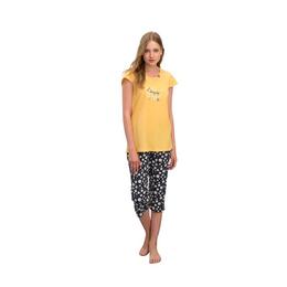 Croiul produsului este clasic, cu pantalon trei sferturi si bluza cu maneci scurte cu imprimeu. Culorile sunt placute, revigorante, aducand un plus de prospetime. Este alegerea ideala pentru femeile practice.