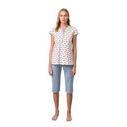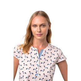 Pijama de dama Vamp, realizata din 100% bumbac jersey specific pentru sezonul de primavara-vara. Materialul este usor, compact, igienic si foarte placut la purtare. Croiul este clasic cu bluza de o lungime de 68 cm si prezinta o fenta stilizata, cu 5 nasturi functionali.