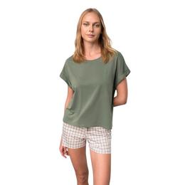 Pijama de dama Vamp, realizata din 50% bumbac 50% modal extras din lemn de fag. Materialul mixt este deosebit de placut la purtare, avind un touch deosebit. Croiul este tip lounge, cu maneci lasate, si prezinta un element de broderie discret pe piept. Pantalonul scurt are talie medie elastica si snur.