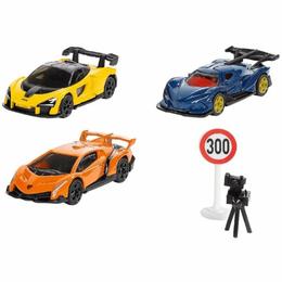 Noul set “Supercars” este format din trei masini extraordinare: Lamborghini Veneno, Apollo I.E. si McLaren Senna, toate fiind realizate din metal si vopsite in culori originale. Setul contine un radar realizat stilizat din plastic rezistent si un indicator rutier de limita a vitezei inscriptionat cu “300”.