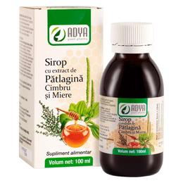Sirop cu Extract de Patlagina, Cimbru si Miere Adya Green Pharma, 100 ml: formula imbogatita cu cimbru de cultura a siropului cu patlagina si miere Adya Green Pharma reprezinta varianta optima pentru calmarea cailor respiratorii, ajutand la fluidificarea secretiilor bronsice si eliminarea lor.