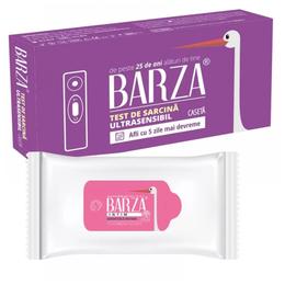 Test de Sarcina - Barza Ultrasensibil Caseta + Servetele Umede, 1 buc: este un test rapid care depisteaza prezenta hormonului hCG (gonadotropina corionica umana) in urina, inca din primele zile ale sarcinii. Testul poate fi utilizat cu 5 zile inainte de data probabila a urmatoarei menstruatii, in orice moment al zilei. Cu ajutorul Testului de sarcina Barza Ultrasensibil poate fi depistata si sarcina extrauterina. Servetelele intime Barza cu solutie de bicarbonat de sodiu sunt special concepute pentru asigurarea unei igiene intime corespunzatoare, pentru eliminarea senzatiei de disconfort si a mirosurilor neplacute. Actioneaza in mod delicat pentru a curata si reda prospetimea zonei intime.