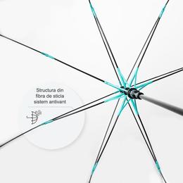 Sistemul de deschidere este foarte practic, umbrela deschizandu-se prin simpla apasare a unui buton ce activeaza un arc puternic.