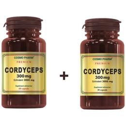 Cordyceps 300 mg, Cosmo Pharm Premium:este un supliment alimentar obtinut dintr-o ciuperca medicinala cu importante proprietati terapeutice, bogata in beta-caroten, vitaminele C si E, seleniu, fermenti si aminoacizi. Contribuie la cresterea imunitatii, sustine functionarea optima a sistemului respirator, cardio-vascular, endocrin si reproducator, reduce reactiile alergice, este un adjuvant eficient in bolile autoimune, are actiune antitumorala, intarind organismul in chimioterapie, combate radicalii liberi si stresul oxidativ datorita proprietatilor sale antioxidante, intarziind procesele de imbatranire. Sustine sanatatea inimii, asigura o digestie eficienta, reduce colesterolul LDL, regenereaza celulele hepatice afectate de boli, stimuleaza functia hepatica si renala, favorizeaza detoxifierea organismului, controleaza nivelul de insulina si de zahar din sange, are efecte benefice in cazul bolilor respiratorii, in stari gripale, tuse etc, combate oboseala cronica si slabiciunea, imbunatateste capacitatea de adaptare a organismului la factorii de stres, reduce durerile musculare si imbunatateste rezistenta la efort si performantele fizice, este un afrodisiac natural.