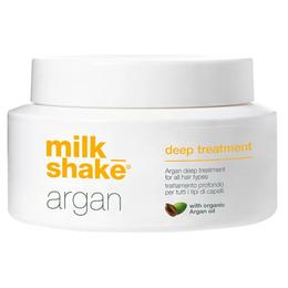 Masca Tratament cu Ulei de Argan pentru Toate Tipurile de Par - Milk Shake Argan Deep Treatment, 200 ml: tratament pentru toate tipurile de par, cu o formula nutritiva pe baza de proteine de grau si ulei organic de argan ce elimina electrizarea firului de par, sigiland cuticula, lasandu-l mai catifelat, stralucitor si mai usor de modelat. Ajuta la mentinerea indelungata a culorii, pastrandu-i intensitatea. Uleiul de argan reface structura interioara a firului de par si actioneaza impotriva imbatranirii.