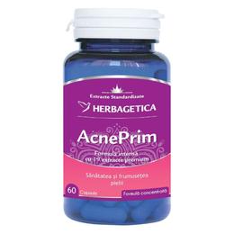 AcnePrim Herbagetica, 60 capsule: are o compozitie complexa cu 19 extracte naturale care actioneaza de la interior pentru a curata tenul de acnee; este un produs care se poate folosi pentru mai multe tipuri de acnee inclusiv cea de cauza hormonala sau bacteriana. AcnePrim se poate administra persoanelor aflate la varsta adolescentei, incepand cu varsta de 12 ani, persoanelor cu ten matur, cu tendinta acneica (25-35 ani). Este recomandat si femeilor cu dezechilibre hormonale care cauzeaza acnee, dar si persoanelor cu acnee de cauza bacteriana.