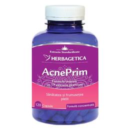 AcnePrim Herbagetica, 120 capsule: are o compozitie complexa cu 19 extracte naturale care actioneaza de la interior pentru a curata tenul de acnee; este un produs care se poate folosi pentru mai multe tipuri de acnee inclusiv cea de cauza hormonala sau bacteriana. AcnePrim se poate administra persoanelor aflate la varsta adolescentei, incepand cu varsta de 12 ani, persoanelor cu ten matur, cu tendinta acneica (25-35 ani). Este recomandat si femeilor cu dezechilibre hormonale care cauzeaza acnee, dar si persoanelor cu acnee de cauza bacteriana.