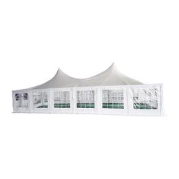 Acest cort de evenimente foarte ușor de montat are structură din oțel zincat, cu protecție anticorozivă, iar prelata robustă este din folie PVC de 500g/mp. Atât prelata, cât și pereții laterali asigură protecție solară de 80+, rezistență UV, impermeabilitate 100%. Mai multe variante de configurare sunt posibile: pereții laterali pot fi montați individual la o distanță de 2m.