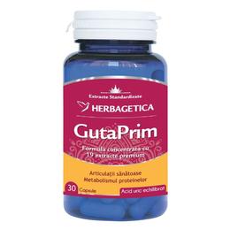 GutaPrim Herbagetica, 30 capsule: are o formula complexa cu 19 extracte naturale dedicate pentru a reduce exesul de acid uric din organism si pentru a reduce inflamatia. Compozitia sa, formata doar din extracte din surse naturale superioare actioneaza pentru a drena fluidele in exces, acidul uric si pentru a ajuta la refacerea mobilitatea articulatiilor afectate de guta. GutaPrim se recomanda persoanelor care au inflamatie articulara, exces de acid uric, guta, obezitate sau retentie de apa.