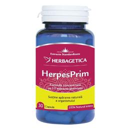 HerpesPrim Herbagetica, 30 capsule: are o formula concentrata cu 13 extracte premium, recomandat in cazul infectiilor cauzate de virusul herpes simplex (HSV). Acest virus se manifesta prin eruptii dureroase pe piele, roseata si umflaturi apoase pe membranele mucoase. Produsul este antiviral herpetiv, imunostimulator, dermoregenerator, antioxidant si antiinflamator.