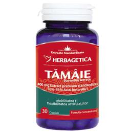 Tamaie Boswellia Serrata Herbagetica, 30 capsule: are o eficienta ridicata in refacerea mobilitatii articulare, reducerea durerii si a inflamatiei. Tamaia este cel mai des utilizata pentru afectiunile oasteo-articulare, astfel este benefica in caz de artrita reumatoida, osteoartrita, dureri articulare puternice, inflamatie la nivel articular.
