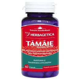 Tamaie Boswellia Serrata Herbagetica, 60 capsule: are o eficienta ridicata in refacerea mobilitatii articulare, reducerea durerii si a inflamatiei. Tamaia este cel mai des utilizata pentru afectiunile oasteo-articulare, astfel este benefica in caz de artrita reumatoida, osteoartrita, dureri articulare puternice, inflamatie la nivel articular.