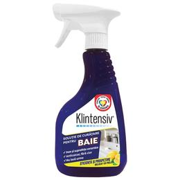 Solutie de Curatare pentru Baie Klintensiv, 500 ml: este utilizat pentru curatarea suprafetelor din baie, gresie, faianta, ceramica, elemente cromate, elemente din plastic si sticla. Produsul este compatibil cu majoritatea materialelor precum: otel inoxidabil, metale cromate, cupru, aluminiu, zinc, sticla, ceramica, teflon, plastic, cauciuc sau silicon.