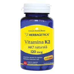 Vitamina K2 MK7 Naturala 120 mg Herbagetica, 60 capsule vegetale: asigura densitatea osoasa optima si mentine sanatatea oaselor; fortifica sistemul imunitar; activeaza capacitatea naturala de aparare a organismului; mentine concentratia normala de calciu in sange; asigura absorbtia completa a calciului si a fosforului in organism; asigura flexibilitatea si mobilitatea articulatiilor. In asocierea cu Vitamina D3 naturala acest produs asigura un efect garantat asupra sistemului osteoarticular.