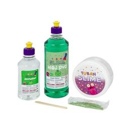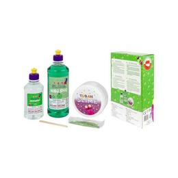 - setul contine 500 ml lipici PVA turcoaz cu miros de mere, 250 ml activator, 5g de sclipici verde, o spatula, cana de masurare (100ml) si un recipient plastic pentru slime