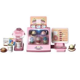 Setul compus din 28 piese care imita realitatea (aparat de cafea, raft refrigerator, casa de marcat, 6 inghetate frumos decorate, farfurie, 2 pahare, 2 cutiute de alimente, 3 capacele ce imita cafeaua, 6 banuti, card)