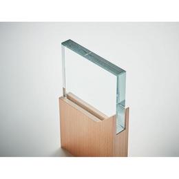 Trofeu rotund din sticla pe o baza din lemn de fag, intr-o cutie de cadou.