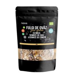 Fulgi de Ovaz Fara Gluten cu Maca, Seminte de Chia si Seminte de Canepa - Niavis, 200 g: mix ideal pentru un mic dejun delicios, sanatos si hranitor, cu o combinatie echilibrata de ingrediente ce asigura un plus de energie organismului, si un aport de fibre, vitamine si minerale.
