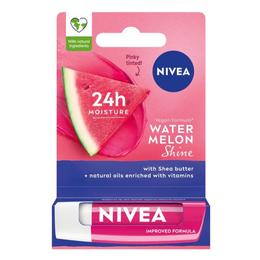 Balsam de Buze Hranitor cu Pepene - Nivea Lip Care Watermelon Shine, 4,8 g: din uleiuri naturale, are o textura catifelata si efect emolient de durata; ofera hidratare pentru 24 de ore. Balsamul are aroma de pepene si pigmenti ce ofera o culoare naturala si stralucire buzelor.