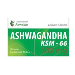 Ashwagandha KSM-66 500 mg - Remedia, 30 capsule: supliment alimentar ashwagandha (Withania somnifera), fiind cunoscuta ca si Ginseng indian, este una dintre cele mai importante plante din categoria adaptogenilor. Adaptogenii sunt plante care ajuta corpul in adaptarea la stres (fizic sau psihic), atat pe termen scurt, cat si pe termen lung. De asemenea, acestia pot intari imunitatea si starea de bine.