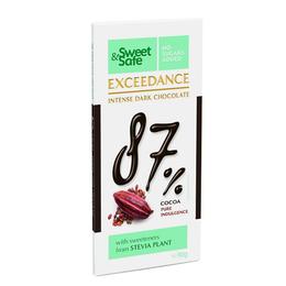 Ciocolata Neagra Intensa 87% Cacao, cu Stevia - Sly Nutritia Sweet&Safe Exceedance, 90 g: ciocolata neagra intensa cu 87% cacao, fara zaharuri adaugate, indulcita cu stevia, desert cu gust special, potrivit pentru orice moment al zilei. Poate fi consumata de persoanele cu diabet sau de toti cei care doresc sa diminueze cresterea nivelului de glucoza in sange.