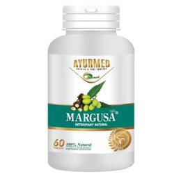 Supliment Alimentar Margusa 100% Natural - Star International Ayurmed, 60 tablete: supliment alimentar 100% natural, din plante medicinale. Margusa sustine functionarea fiziologica a sistemului gastro-intestinal asigurand o digestie si un tranzit intestinal normal care contribuie la procesul natural de detoxifiere prin eliminarea la nivelul colonului a produselor de digestie reziduale si a toxinelor. Ajuta sistemul hepatobiliar in procesul natural de detoxifiere prin sustinerea proceselor de metabolizare, stocare, transformare si eliminare a toxinelor din organism.