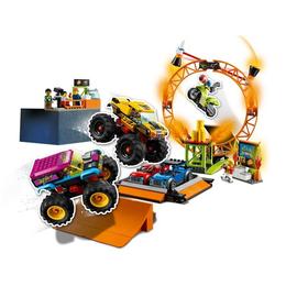 Setul de joc LEGO City Arena de cascadorii include o motocicleta actionata de volant si recuzita pentru actiune spectaculoasa de cascadorii. Copiii pot lansa jucaria motocicleta de cascadorii printr-un inel de foc, pot realiza salturi inapoi si cascadorii cu 2 camioane gigant cool, si pot reconfigura cu usurinta modulele de cascadorii pentru spectacole diferite. Vine cu 6 minifigurine, inclusiv 3 personaje din serialul LEGO City.
