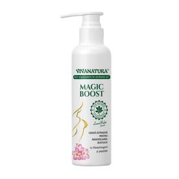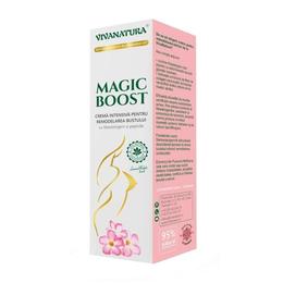Crema Intensiva pentru Remodelarea Bustului cu Fitoestrogeni si Peptide - Vivanatura Magic Boost, 145 ml: crema pentru remodelare sanilor cu o tripla actiune: contine fitoestrogeni (din plante) cu efect benefic asupra glandei mamare; intareste continutul de fibre de colagen si elastina; amplifica stratul adipos de la nivelul sanilor. Totodata prin sinergia fitoestrogenilor si a peptidelor, aceasta crema favorizeaza volumul bustului printr-un efect cosmetic asemanator lipo-liftingului. Eficienta este dovedita prin studii certificate asupra substantelor active.