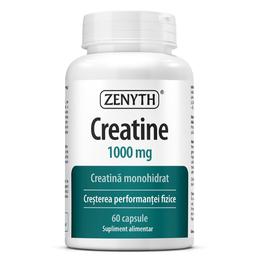 Creatina 1000 mg - Zenyth Pharmaceuticals Creatine, 60 capsule: supliment alimentar cu creatina monohidrat pentru cresterea performantei fizice si refacerea rezervelor de energie; cea mai studiata forma de creatina pentru sportivi, refacere si crestere musculara. Mentine vitalitatea organismului in cazul persoanelor cu diete vegetariene sau care practica sport si creste forta si masa musculara, alaturi de un nivel corespunzator de activitate fizica, sustine sanatatea creierului, stimuland vigilenta, concentrarea si atentia, in special in cazul persoanelor varstnice.