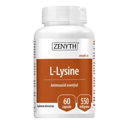 L-Lysine 550 mg Amionacid Esential - Zenyth Pharmaceuticals, 60 capsule: supliment alimentar ce contine L-lizina, recomandat vegetarienilor, persoanelor cu imunitate scazuta si predispozitie la eruptii herpetice, femeilor la menopauza, varstnicilor, sportivilor, celor care consuma suplimente cu arginina, precum si pentru recuperarea si refacerea organismului dupa exercitii fizice intense, operatii sau accidentari. Lizina este esentiala pentru organism, stimuleaza sistemul imunitar. Lizina este un aminoacid esential, cu rol important in cresterea si regenerarea tesuturilor, in productia de hormoni, enzime si anticorpi. Echilibreaza nivelul de calciu din organism, mentinand sanatatea oaselor. Reduce anxietatea, stresul si echilibreaza nivelul de cortizol.