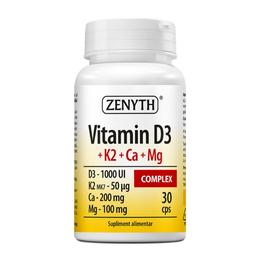 Vitamina D3 + K2 + Ca + Mg Complex - Zenyth Pharmaceuticals, 30 capsule: complex de vitamine si minerale, cu efect benefic asupra sistemului osos si sistemului cardiovascular. Vitamin D3+K2+Ca+Mg Complex poate fi folosit pentru intarzierea imbatranirii cardiovasculare si prevenirea osteoporozei, de catre adulti si varstnici. Vitamina D3 ajuta la asimilarea calciului si fosforului, la mentinerea sanatatii sistemului osos, la intarirea imunitatii. Vitamina K2 contribuie la transferul calciului in oase si dinti si previne calcifierea vasculara. Calciul si magneziul contribuie la functionarea normala a sistemului osos si muscular si la o neurotransmisie normala.
