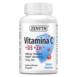 Vitamina C + D3 + Zn - Zenyth Pharmaceuticals, 60 capsule: supliment alimentar recomandat pentru sustinerea imunitatii in infectiile virale respiratorii. Vitamina C, vitamina D3 si zincul actioneaza pentru cresterea rezistentei organismului la infectiile de tract respirator superior. Pe langa sustinerea imunitatii, vitamina C contribuie la functionarea normala a sistemului nervos, la metabolismul energetic normal, la formarea normala a colagenului pentru functionarea normala a pielii, a sistemului osos, a ligamentelor, a gingiilor si dintilor.