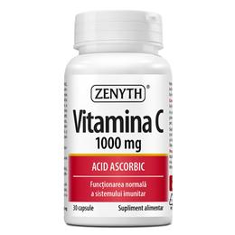 Vitamina C 1000 mg Acid Ascorbic - Zenyth Pharmaceuticals, 30 capsule: supliment alimentar cu vitamina C pura, pentru intarirea imunitatii in infectii virale, ce ofera protectie antioxidanta, reduce simptomele si durata virozelor respiratorii, contribuie la formarea colagenului in organism, sustine nivelul de energie, mentine sanatatea sistemului nervos, reduce starile de oboseala si extenuare.