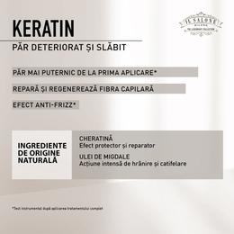 Mod de utilizare: aplicati pe parul umed, dupa samponarea cu Keratin Shampoo, masati, apoi lasati sa actioneze 5 minute. Clatiti bine. Ritual complet de infrumusetare: Keratin Shampoo, Keratin Conditioner, Keratin Mask. Cel mai bun ritual profesional de ingrijire delicata a parului deteriorat si slabit, care-i pune in valoare frumusetea naturala.