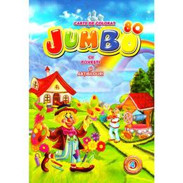 Carte de colorat Jumbo 4 cu povesti si abtibilduri, editura Eurobookids: Cartea de colorat Jumbo 4 cu povesti si abtibilduri contine povesti adaptate si prescurtate, redactate cu litere mari de tipar pentru micutii care invata sa citeasca. Desenele gata pentru a fi colorate sunt de mari dimensiuni avand contururile clare si precise. Cartea include doua planse cu abtibilduri, cate un abtibild pentru fiecare pagina de colorat.