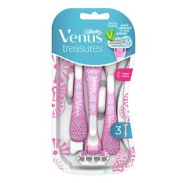 Aparat de Ras cu 3 Lame pentru Femei - Gillette Venus Treasures Pink, 3 buc: aparat de ras de unica folosita, cu 3 lame si maner ergonomic pentru un ras delicat, aproape de piele, realizat cu usurinta. Aparatele de ras au banda lubrifianta activata pe baza de apa pentru un ras mai facil cu o miscare fluida, de alunecare. Au un cap rotunjit si pivotant care se adapteaza la contururile corpului pentru un ras delicat in zonele dificile.