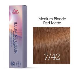Vopsea Permanenta - Wella Professionals Illumina Color, nuanta 7/42 Medium Blonde Red Matte, 60 ml: formula profesionala permanenta cu o textura cremoasa delicata si complexa ce garanteaza atat hranirea si ingrijirea parului, cat si o acoperire a firelor albe de pana la 100%, datorita tehnologiei Microlight, care ofera o protectie excelenta stratului cuticular, pastrand limpezimea nuantei, ceea ce determina trecerea luminii prin fibra capilara si reflexia intregului spectrului cromatic. Acest produs este ideal pentru culori clare si intense, pline de lumina si uniformitate, un aspect natural, tanar, fermecator.