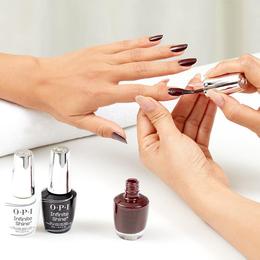 2. Se aplica apoi 2 straturi de lac de unghii cu efect de gel OPI Infinite Shine, cu o formula creata pe baza unui oligomer special ce reactioneaza in momentul aplicarii topului de sigilare si la expunerea la lumina naturala, formand o retea de legaturi polimerice ce consolideaza stratul de culoare.