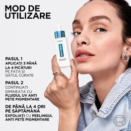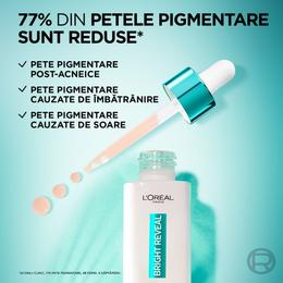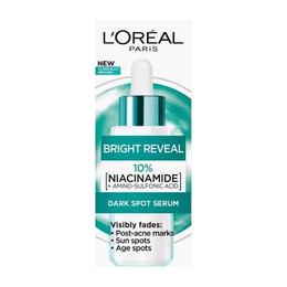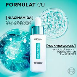 Ser cu Niacinamide Impotriva Petelor Pigmentare L'Oreal Paris - Bright Reveal 10% Niacinamide Dark Spot Serum, 30 ml: contine un complex de 10% niacinamide si acid aminosulfoni ce lasa pielea mai stralucitoare. Serul ajuta la reducerea petelor, ajuta la tratarea acneei si reducerea ridurilor. Niacinamida are efect calmant si ajuta la reducerea petelor. Acidul aminosulfonic este un ingredient delicat exfoliant. Formula non-lipicioasa si non-grasa a serului nu provoaca puncte negre si poate fi folosita inainte de machiaj.