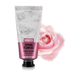 Crema de Maini Naturala cu Trandafir si Muscata - Biobaza Hand Cream Spring Flowers, 30 ml: crema de maini cu 97% ingrediente de origine naturala, ulei de migdale, unt de shea, proteine din orez si ulei din seminte de struguri, susan si seminte de bumbac, ce calmeaza pielea iritata. Este imbogatita cu uleiuri de lemn de trandafir si muscata, ce stimuleaza reinnoirea pielii. Are textura aerata, un parfum delicat, pudrat, nu lasa reziduri grase, inmoaie si previne uscarea mainilor. Crema este perfecta pentru mainile cu piele sensibila.