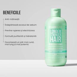 Sampon pentru Par si Radacini Grase - Hairburst Longer Stronger Hair For Oily Scalp&Roots Shampoo, 350 ml: sampon purificator pentru curatarea in profunzime a scalpului, indeparteaza si reduce rapid excesul de ulei. Totodata samponul curata si reziduurile care se acumuleaza pe par din apa dura de la robinet, care pot face parul sa se ingrase mai repede si il ajuta ca creasca mai lung si mai sanatos. Contine ingrediente anti-matreata si antistatice pentru a preveni incretirea si ruperea. Cu parfum de ananas si nuca de cocos, samponul ajuta la retinerea umiditatii si ofera o senzatie de curat si proaspat care dureaza. Sampon potrivit pentru parul si scalpul care se ingrasa repede. Produs vegan. Fara parabeni si SLS.