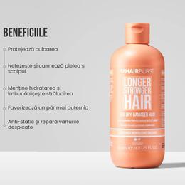 Balsam pentru Par Uscat sau Deteriorat - Hairburst Longer Stronger Hair For Dry, Damaged Hair Conditioner, 350 ml: balsam cu parfum de smochine si vanilie, pentru parul uscat si deteriorat ca urmare a coafarii termice, vopsirii si factorilor externi, in timp ce fortifica si sustine cresterea unui par mai lung, mai puternic si mai des. Formulat cu uleiuri de migdale si smochine, acesta hraneste si repara parul, redandu-i stralucirea. Balsamul hidrateaza parul si scalpul, retine umezeala in cuticule si preintampina varfurile despicate, protejeaza culoarea parului dupa vopsire si are proprietati antistatice. Produs vegan. Fara parabeni si SLS.