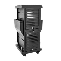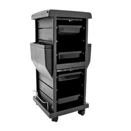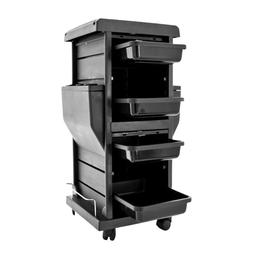 Carucior Cosmetica T-100C - Beautyfor Hair Salon Trolley, Negru, 1 buc: este un carucior de cosmetica rezistent cu roti. Are 4 sertare, 15 compartimente si 2 sectiuni care se pot inchide. Greutatea caruciorului este de 5 kilograme.