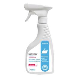 Dezinfectant pentru Suprafete RTU - Klintensiv Professional Medical, 500 ml: este o solutie pe baza de saruri cuaternare de amoniu, care are proprietati detergente si dezinfectante cu spectru larg de actiune biocida. Dezinfectantul este eficient pentru curatarea si dezinfectarea diferitelor tipuri de suprafete, si instrumentarului din diferite domenii. Produsul este ideal pentru utilizarea in spitale, unitati de primiri urgente, centre de triaj, policlinici, clinici si cabinete medicale. Contine agenti tensioactivi cu capacitate buna de curatare si spumare redusa.