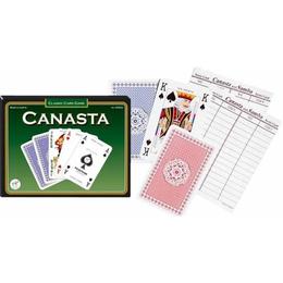 Fiecare pachet din cele 2 contine 52 de carti de joc cu figuri standard si 3 jokeri. Cartile de joc din cele 2 pachete sunt inscriptionate cu punctele de valoare de la jocul de Canasta. Cutia este eleganta, de culoare verde. Cartile de joc din cele 3 pachete au un frumos model pe spate iar culoarea modelului este la toate cartile de joc din set albastra sau rosie (in imagine sunt prezentate cele 2 modele posibile, albastru si rosu).