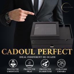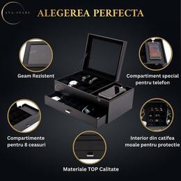 Imbratiseaza luxul in fiecare zi. Imagineaza-ti cum deschizi elegant capacul si esti intampinat de interiorul sau captusit cu catifea fina, unde fiecare ceas straluceste ca o bijuterie. Pentru barbatul modern care nu face compromisuri, aceasta cutie reprezinta esenta stilului si functionalitatii de inalta calitate.