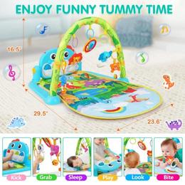 1.In prima etapa bebelusul sta intins pe spate si se poate juca cu jucariile care atarna, muzica este activata cand pianul este lovit cu picioarele.